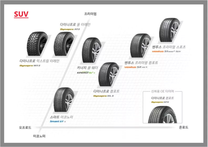 왼쪽에 있는 제품일수록 오프로드 성향이 강하며, 오른쪽에 있는 제품일수록 온로드 성향이 강한 제품입니다. 가격은 승용차용 한국타이어 등급표와 동일하게 아래에서 위로 갈수록 비싸집니다.