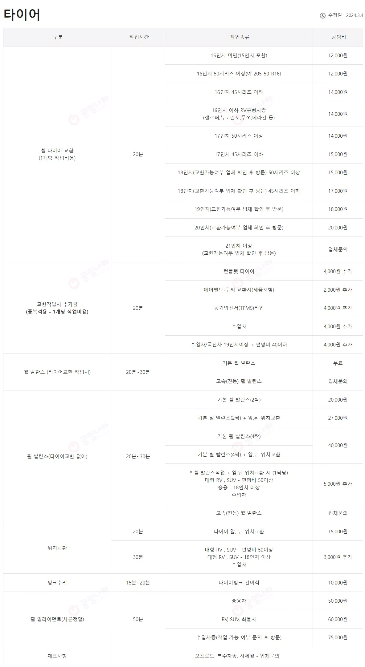 단, 일부 지점에서는 표준 공임 적용 범위가 조금 다를 수 있기 때문에 방문하려는 지점에 미리 확인해 보는 것이 좋습니다.